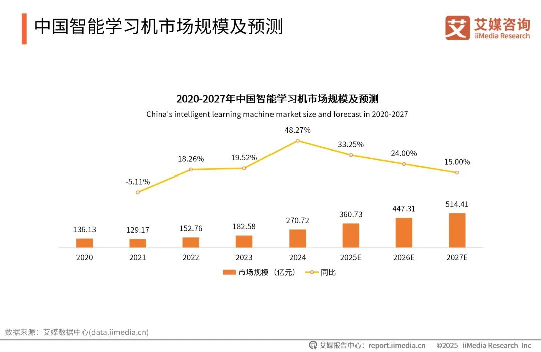 艾瑞咨询显示,中国智能学习机市场2024年市场规模达270.72亿元,同比增长48.27%,预计2027年中国智能平板学习机市场规模将超500亿元,成为智能硬件领域增速最快的赛道之一。