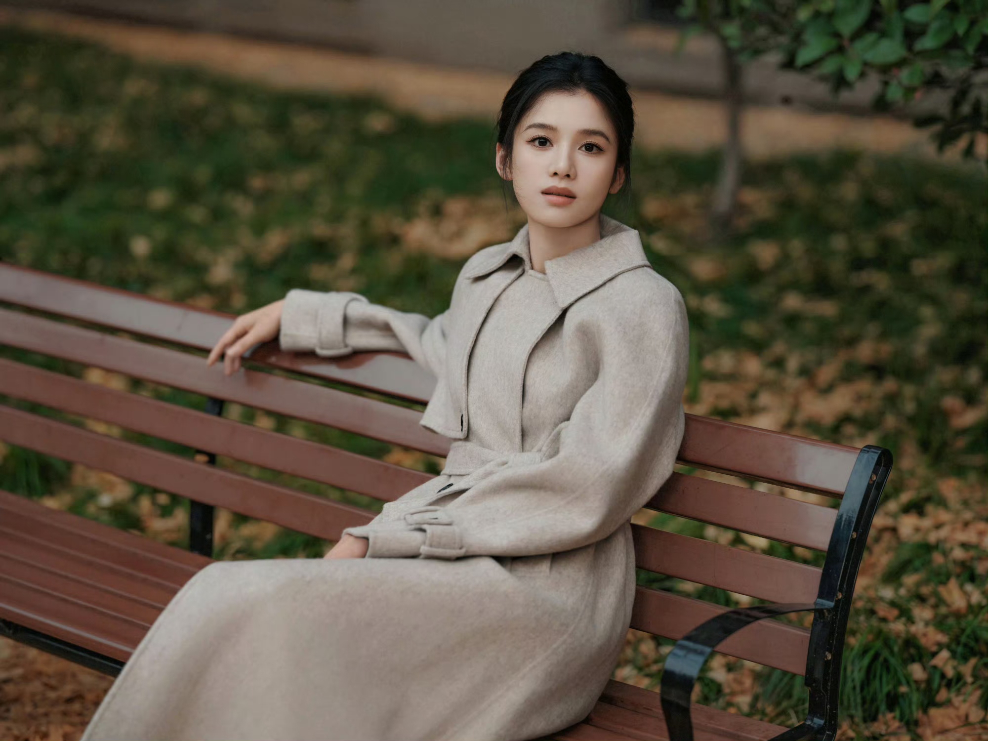 她的美从来不是“攻击性”的,更像“浸润式”的。早年在《风犬少年的天空》里,她是把白衬衫穿得又倔强又软萌的李安然,发梢沾着阳光的碎金;后来在《点燃我,温暖你》里,她是裹着黑大衣也藏不住清冷的朱韵,眼神里有碎冰般的坚韧;而戏外的她,总带着点“钝感的温柔”——像这组图里,她穿着最基础的呢大衣,没有亮片、没有夸张剪裁,却靠眼神里的安静、姿态里的舒展,把“秋冬通勤装”穿成了独一份的氛围。她不必刻意“融入”秋景,只是站在那里,手插兜的松弛、偏头时的轻软,就让自己成了秋景的一部分。