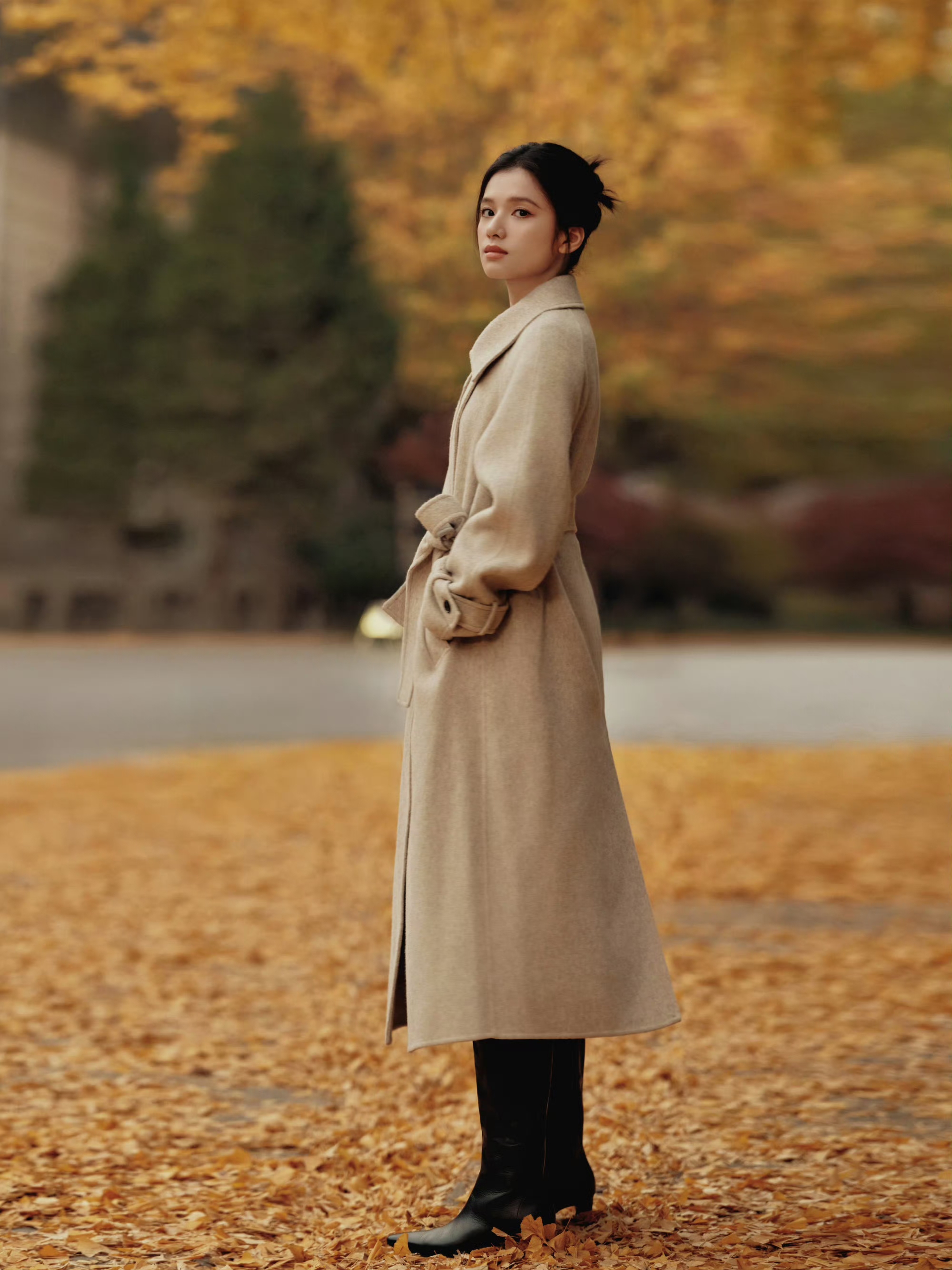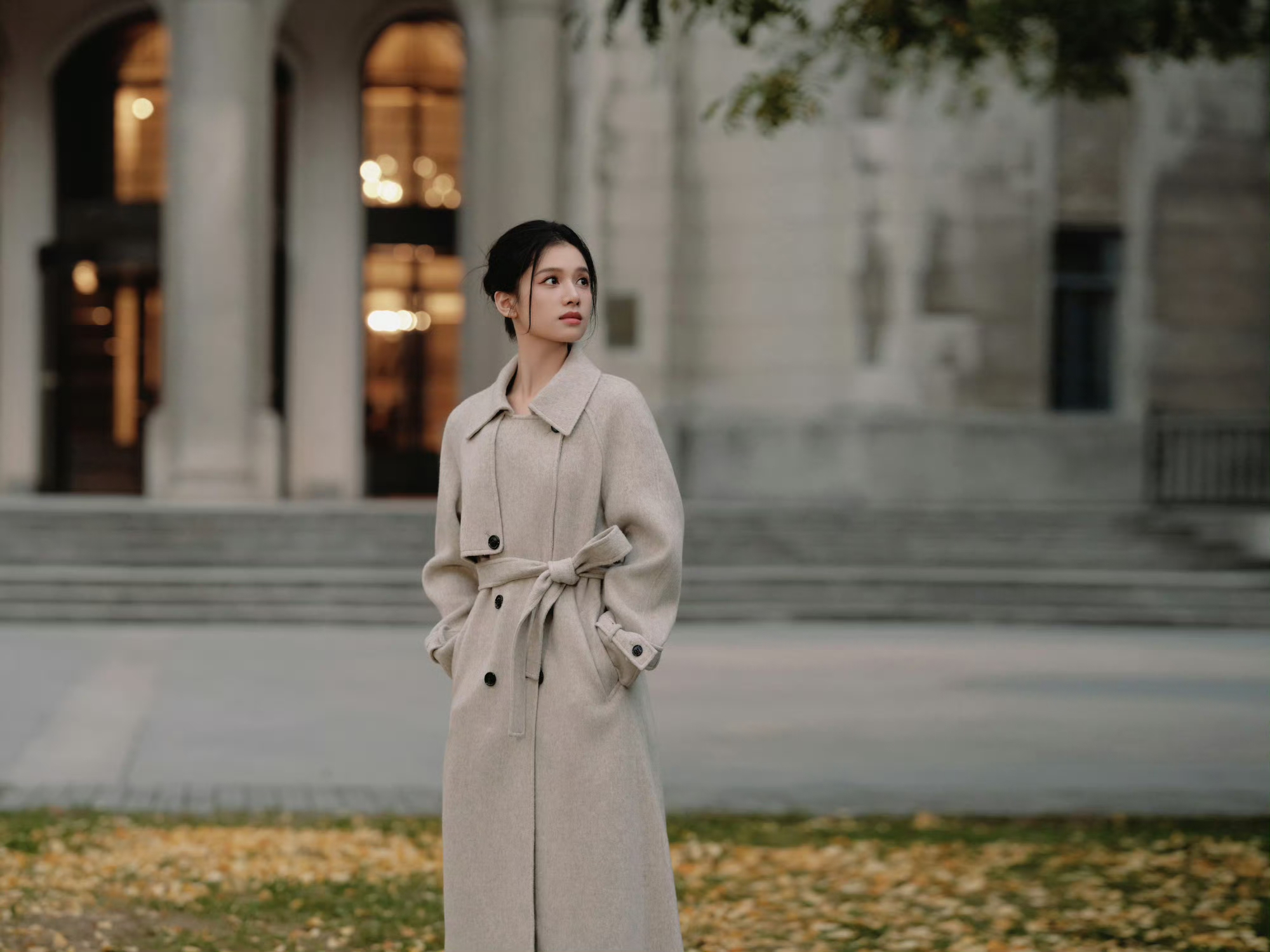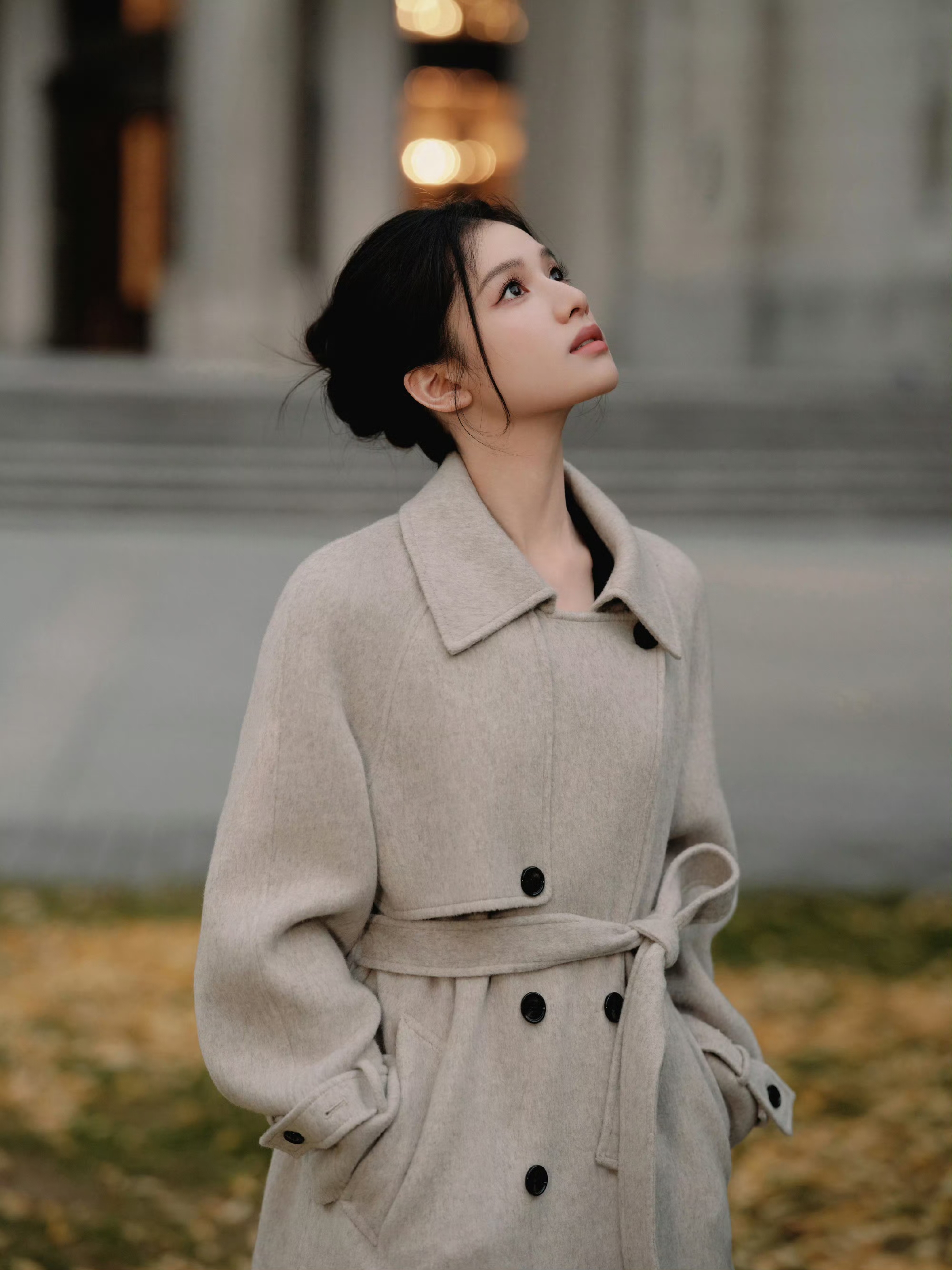 她像深秋里被时光特意慢放的一笔:低挽的黑发松松挽成发髻,几缕碎发垂在颈侧,恰好中和了呢大衣的利落轮廓;浅灰的面料裹着她的肩背,宽幅腰带轻轻收出腰线,既保留了秋冬服饰的松弛暖意,又藏着不张扬的精致——连袖口随意堆叠的褶皱,都像是秋光恰好落在这里的痕迹。她倚在石阶旁时,身后的建筑廊柱与暖黄灯影成了模糊的焦糖色背景,唯有她的侧脸浸在秋光里:眉峰是浅淡的,眼尾带着一点未散的软意,唇色是像落叶般的暖调,不是张扬的明艳,是像落叶摩挲地面那样的、轻软的好看。